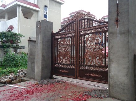 不要經(jīng)常用有水漬(或其他溶液)的手打開門鎖,以免其變色。在打開或轉(zhuǎn)動門鎖把手時,不要用力過猛,這樣會降低門鎖的使用壽命。合頁、門鎖等常用五金,一旦松動,應(yīng)立即擰緊.當門鎖打開不正常時,可在鎖孔內(nèi)加入適量的鉛筆沫,切記用食用油等物品潤滑。, 漆面出現(xiàn)結(jié)皮或粗粒現(xiàn)象時,應(yīng)采取過濾措施,以免刷漆后漆膜不平整,堵塞噴槍。, 4、廠家的生產(chǎn)加工工藝:正規(guī)廠家生產(chǎn)的別墅鋁藝大門,其加工比較精細,切線流暢、角度一致,在拼接過程中應(yīng)該不會出現(xiàn)較明顯的縫隙,密封性能好,開關(guān)順暢。劣質(zhì)的庭院別墅大門,特別是鋁合金室外產(chǎn)品如果加工不合格,會出現(xiàn)密封性質(zhì)問題,不僅漏風漏雨,而且在強風和大的外力的作用下,玻璃會出現(xiàn)炸裂、脫落現(xiàn)象,從而給業(yè)主造成損失財物甚至傷人的現(xiàn)象。, 為保持鋁藝院門的原色,需對鋁藝院門進行兩次以上的磷化處理,在其表面形成一層保護膜,浸泡數(shù)分鐘,這之后還要經(jīng)過噴涂保護漆、230℃烘干、自然冷卻等步驟,才能完成一戶完整的鋁藝院門的表面色彩亮感。生產(chǎn)工藝,除油除銹除氧化-水洗-酸洗-拋光-水洗-中和-水洗-著色處理-洗滌-干燥及其他后處理。, 3、沖孔制作的,安裝比較簡單;
