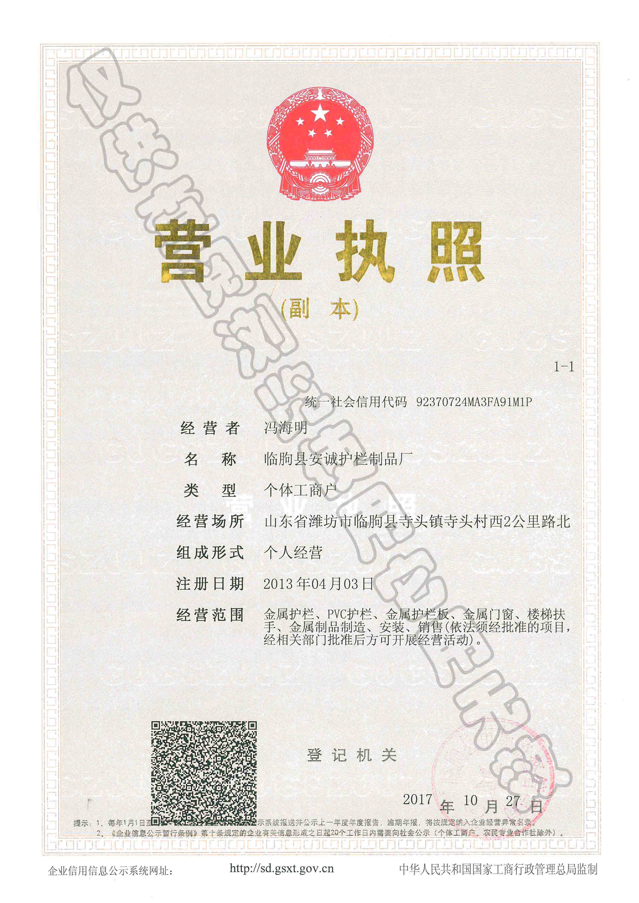 濰坊安誠金屬制品有限公司下設臨朐安誠護欄制品廠,廠址在臨朐呂匣新興工業園,廠房占地20畝, 多年以來,我們秉著“用心打造,用質量說話”的理念,靠“熱情、創新、堅持、 團結”的企業精神,精益求精,以誠為本打造行內知名品牌。 因為誠信所以自信!讓客戶放心,省心,滿意是我們的目的。